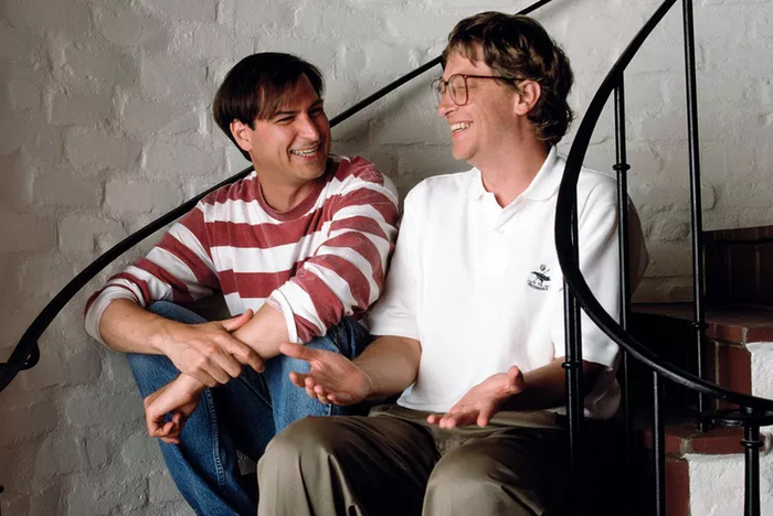 고 스티브 잡스(왼쪽)와 빌 게이츠. Girl Friday Books MC 유재석이 ‘하루에 얼마 쓰는가?’라는 물음에 빌 게이츠는 “저는 꽤 많이 쓴다”라고 솔직하게 얘기했고,“삼성의 폴더블폰을 쓰고 있는데 이재용 회장에게 선물을 받아서 돈은 내지 않았다”라고 잘 알려지지 않은 사실을 밝혔다.