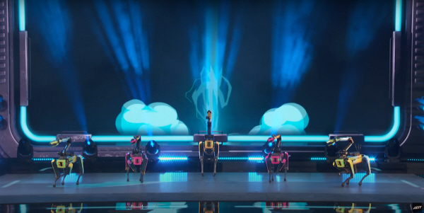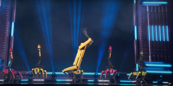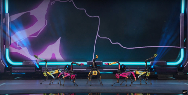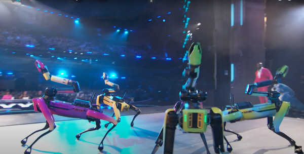 26일 미국 TV쇼 ‘아메리카 갓 탤런트’ 생방송 무대에서 보스턴다이내믹스 스팟이 안무를 선보이고 있다 [이미지 출처=아메리카 갓 탤런트(America’s Got Talent) 유튜브 채널] 비트에 맞춰 칼군무를 선보이고,센터 멤버가 3연속 백 텀블링을 선보인다. 쓰러진 멤버를 일으켜 세우는 모습도 연출한다. 케이팝 아이돌의 무대인가 싶지만 보스턴다이내믹스 사족보행 로봇 개 ‘스팟’이 미국 NBC의 서바이벌 예능 ‘아메리카 갓 탤런트’에서 보여준 공연이다.