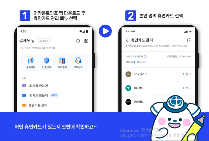 어카운트인포 앱에서 휴면카드 조회·해지 절차. 금융결제원 금융결제원은 2000만장에 달하는 국내 모든 휴면카드를 어카운트인포 애플리케이션(앱)과 홈페이지에서 조회·해지할 수 있다고 28일 밝혔다.