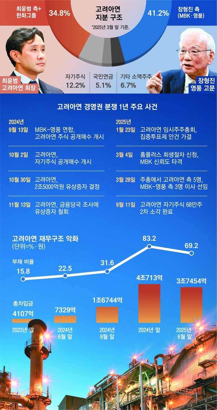 하지만 지난 1년간 분쟁으로 나타난 실제 결과는 이 같은 명분과 거리가 멀다는 평가다. MBK·영풍 측의 거듭되는 의혹 제기로 기업 가치는 갈수록 악화되고,이를 방어하기 위한 최 회장 측 비용도 늘어만 가고 있다.