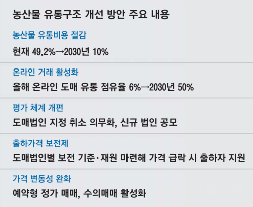 또한 온라인 도매 유통 비중도 대폭 늘린다. 올해 6% 수준인 온라인 비중을 2030년까지 50%로 끌어올리고,시장 규모는 1조원에서 7조원으로 확대할 예정이다. 정부는 이를 통해 현재 49.2%에 달하는 유통비용률을 2030년 10%까지 낮추는 것을 목표로 하고 있다.