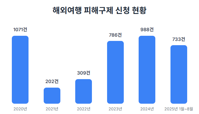 22일 국회 정무위원회 소속 이양수 국민의힘 의원이 한국소비자원으로부터 제출받은 자료에 따르면 지난 2020년부터 올해 8월까지 최근 5년간 소비자원에 접수된 해외여행 피해구제 신청은 총 4039건으로 집계됐다. 코로나19 사태가 한창이던 2020년에만 1071건이 접수됐고 2021년에는 202건,2022년 309건으로 주춤했지만 사회적 거리두기 해제로 해외여행 수요가 살아나면서 이후 다시 증가하는 추세다. 2023년에는 786건,지난해 988건으로 크게 늘었으며 올해는 1~8월에만 733건에 달해 연말까지는 작년 수치를 넘어설 것으로 예상된다.