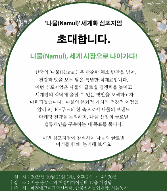 민승규 교수는 “이번 심포지엄을 통해 나물의 세계화 가능성에 대한 공감대를 형성하는 한편 나물 산업의 글로벌 밸류체인을 구축할 수 있는 방안을 모색할 수 있을 것으로 기대한다”며 “맛과 영양이 뛰어나고 보관성도 훌륭한 나물을 세계화함으로써 K푸드가 한 단계 도약할 수 있을 것”이라고 말했다.