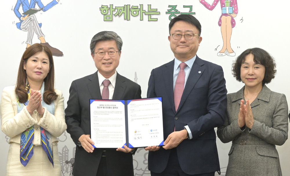 우리은행과 서울 중구가 중구 소재 영업점 21곳에 임산부 전용 좌석을 설치하는 '임산부 올 프리패스' 정책사업에 나선다. 김길성 중구청장,조세형 우리은행 기관그룹장(왼쪽 둘째부터)이 5일 협약식 기념촬영을 하고 있다. 우리은행
