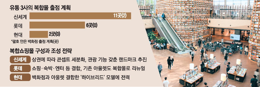 10일 유통업계에 따르면 신세계·롯데·현대 등 유통 3사가 백화점·복합몰 등의 분야에서 향후 출점을 계획 중인 신규 점포는 총 21곳이다. 이 중 복합쇼핑몰이 19곳으로 대부분을 차지한다. 복합몰 확장에 가장 공격적인 곳은 신세계그룹으로 13개 점포를 열 계획이며,이 중 11곳이 복합몰이다. 그룹 내 복합개발사업을 담당하는 신세계프라퍼티는 2030년까지 약 13조원을 투자할 계획이다. 또 롯데와 현대는 각각 6곳,2곳의 복합몰 출점을 계획하고 있다.