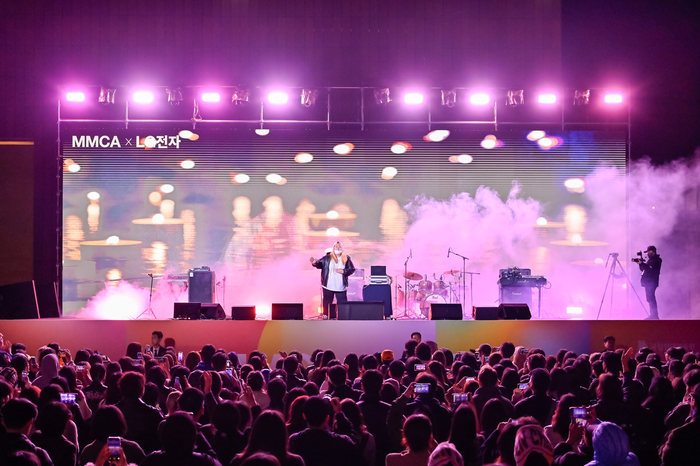 지난달 29일 국립현대미술관 서울관 마당에서 열린 라이브 콘서트에는 2400명이 넘는 관람객이 몰렸다. 인디밴드 글렌체크,전자음악가 키라라,싱어송라이터 수민 등 무대에 오르자 현장은 순식간에 축제의 장으로 변했다. 관객 대부분은 20대와 30대였다. 이들은 미술관에서 제공한 하이볼을 마시며 음악에 맞춰 몸을 흔들었다. 일부는 깃발을 가져와 흔들거나 ‘슬램존’을 만들어 서로 몸을 부딪치며 즐겼다. 공연 막바지 단체로 점프하며 함성을 지르기도 했다. 영상 10도의 쌀쌀한 날씨에도 현장은 열기로 가득했다.