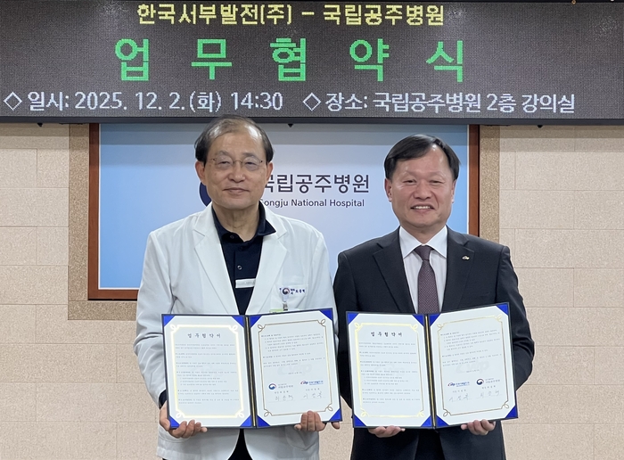 (왼쪽부터) 최종혁 국립공주병원장과 이정복 사장이 정신건강 고위험군 치유 체계 구축 업무협약 후 기념사진을 찍고 있다. [한국서부발전] 한국서부발전이 발전소 근로자의 정신 건강을 보다 체계적으로 관리하기 위해 국립공주병원과 협력한다.
