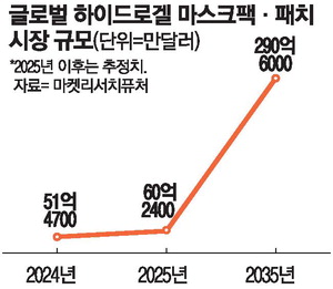 29일 마켓리서치퓨처에 따르면 얼굴 미용 하이드로겔(마스크팩·패치 등)의 올해 세계 시장 규모는 60억2400만달러(약 8조6456억원)로,지난해 51억4700만달러(약 7조3854억원)보다 17%가량 증가한 것으로 추정된다. 2035년엔 290억6000만달러(약 41조6981억원)로,올해보다 5배 이상 확대될 것으로 전망했다.