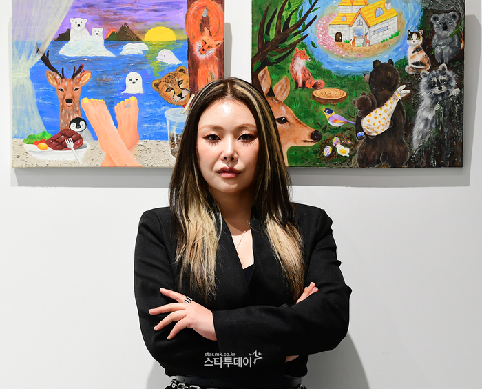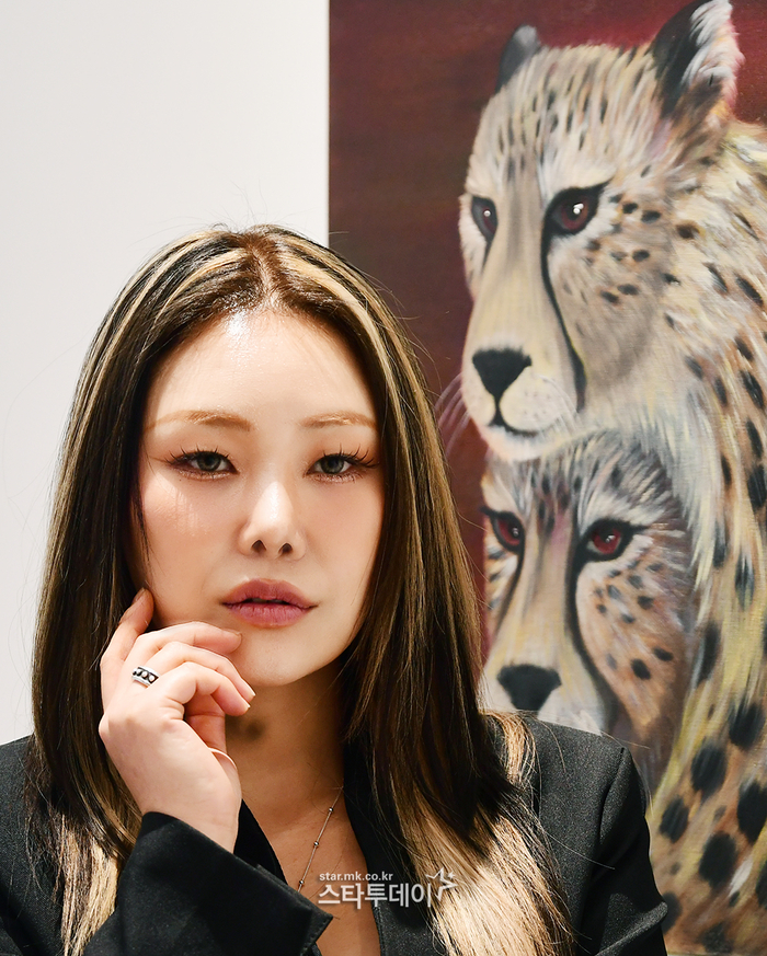치타. 사진l강영국 기자 이번 전시는 치타가 회화 작가 김은영으로서 선보이는 첫 개인전이다. 자연과 동물,인간을 아우르는 모든 생명의 의미를 주제로,초기 제네시스 작품부터 신작까지 총 22점을 선보인다.