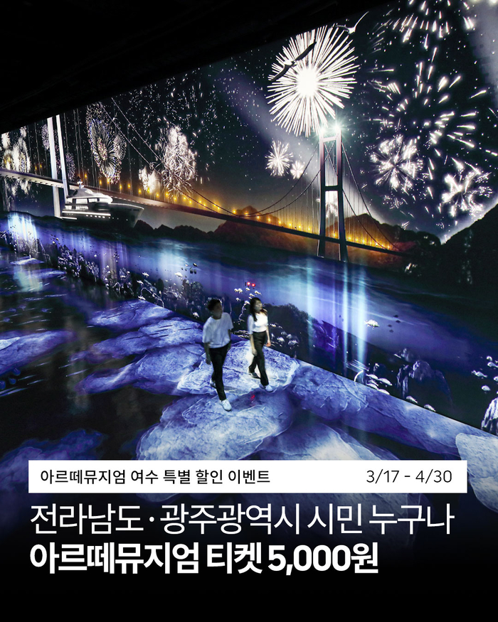 아르떼뮤지엄 여수 양소영 관장은 “이번 지역민 할인 이벤트를 통해 전라남도와 광주 시민들이 보다 부담 없이 미디어아트를 경험하고,가족,친구,연인과 함께 일상 속에서 새로운 문화 경험을 즐기시길 바란다”고 전했다.