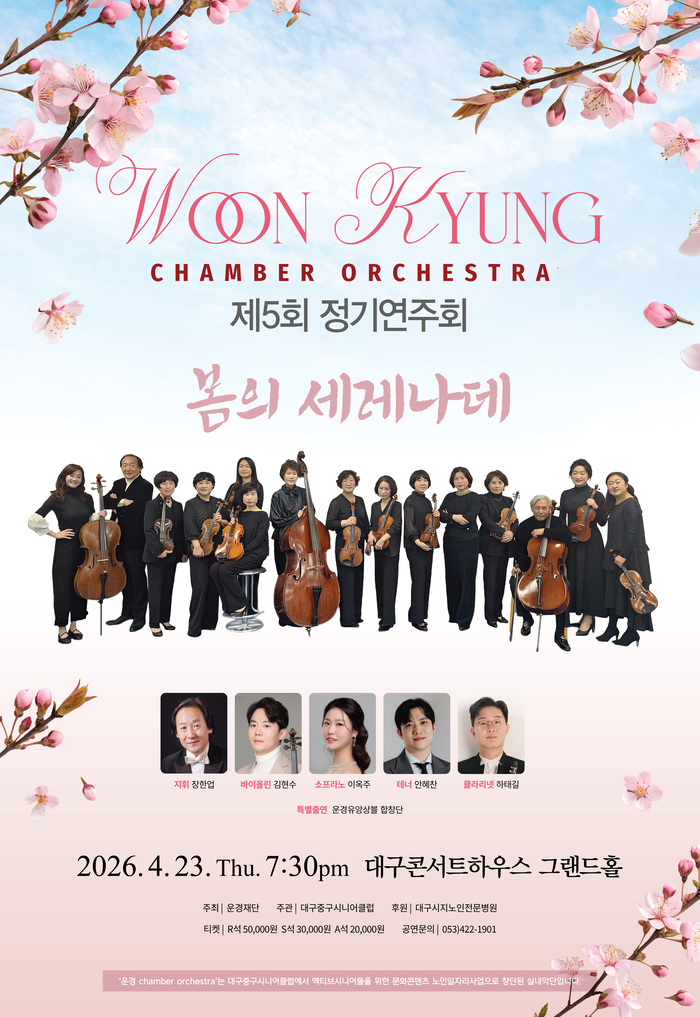 대구중구시니어클럽 권병현 관장은 “올해 공연은 봄의 정서를 담은 선율과 성악,합창이 자연스럽게 이어지는 무대가 될 것”이라며 “관객들이 편안하게 즐기면서도 공연장의 울림을 충분히 느낄 수 있도록 준비하고 있다”고 말했다. 티켓은 R석 5만원,S석 3만원,A석 2만원이다. 공연 관련 문의는 대구중구시니어클럽으로 하면 된다.