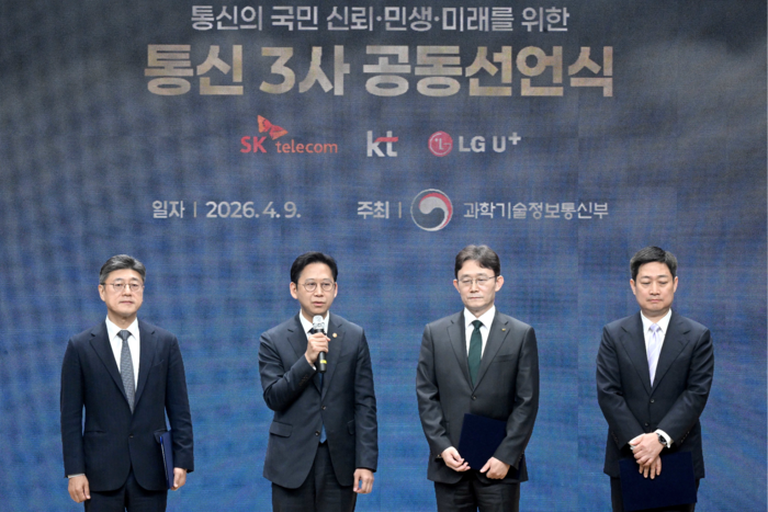 배경훈 부총리 겸 과학기술정보통신부 장관이 9일 오후 서울 강남구 한국과학기술회관에서 열린 통신의 국민 신뢰·민생·미래를 위한 통신3사 공동선언식에서 발언을 하고 있다. (왼쪽부터) 정재헌 SK텔레콤 사장,배경훈 부총리,박윤영 KT 사장,홍범식 LG유플러스 사장. [연합뉴스] 통신당국과 이동통신회사가 간담회를 개최하고 국민의 통신권 보장을 위한 협력을 약속했다. 가계 통신비 부담을 낮추고 정보보안 체계를 강화하는 동시에 인공지능(AI) 인프라 투자에 집중할 방침이다.